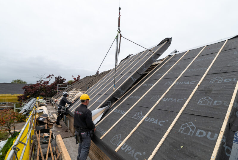 De daken worden niet alleen vernieuwd, maar dus ook verduurzaamd met natuurlijk isolatiemateriaal. „We gebruiken materialen die hernieuwbaar zijn en CO₂ opslaan in plaats van uitstoten”, aldus Eugene Waterreus, duurzaamheidmanager bij Compaen.